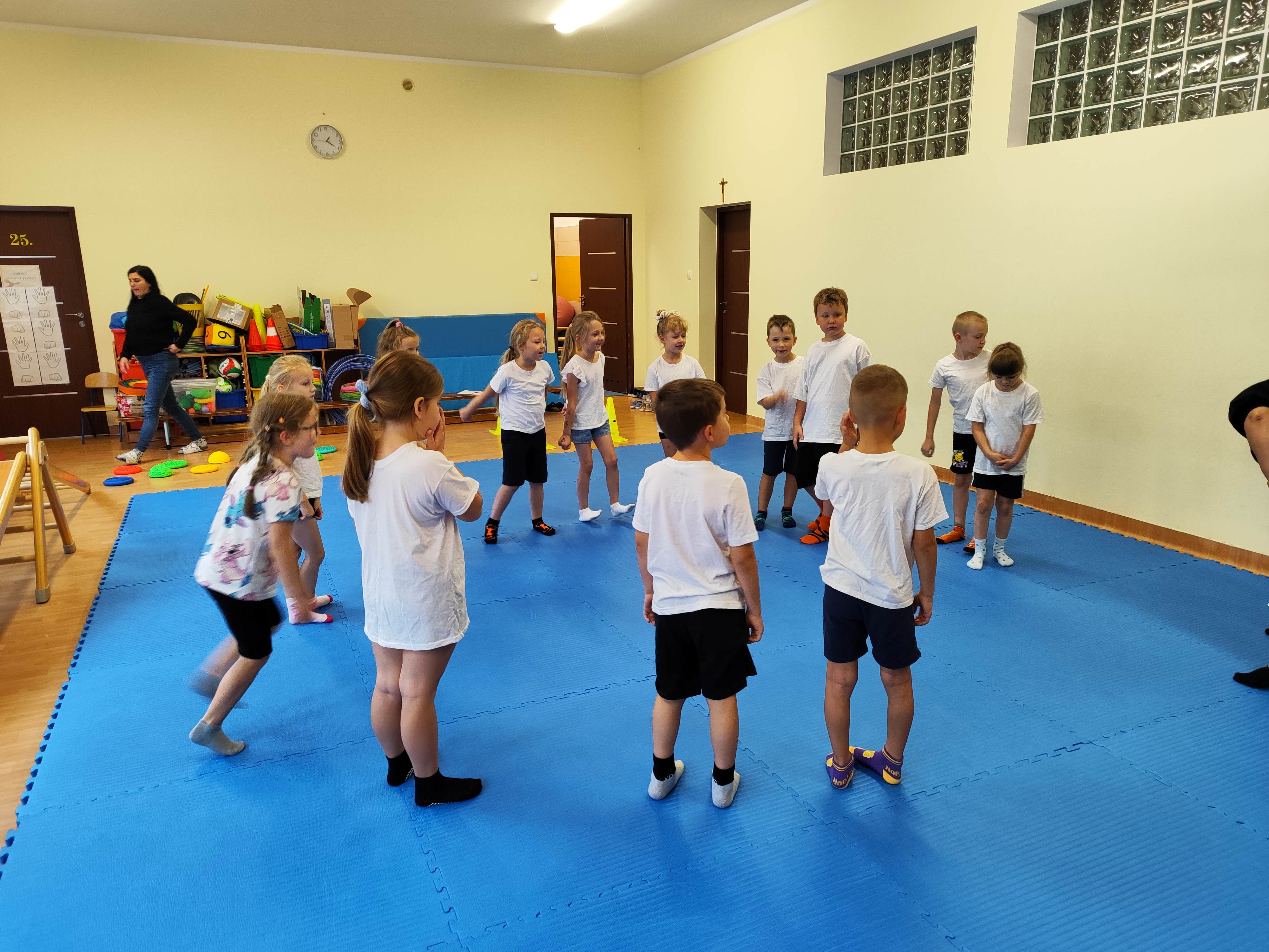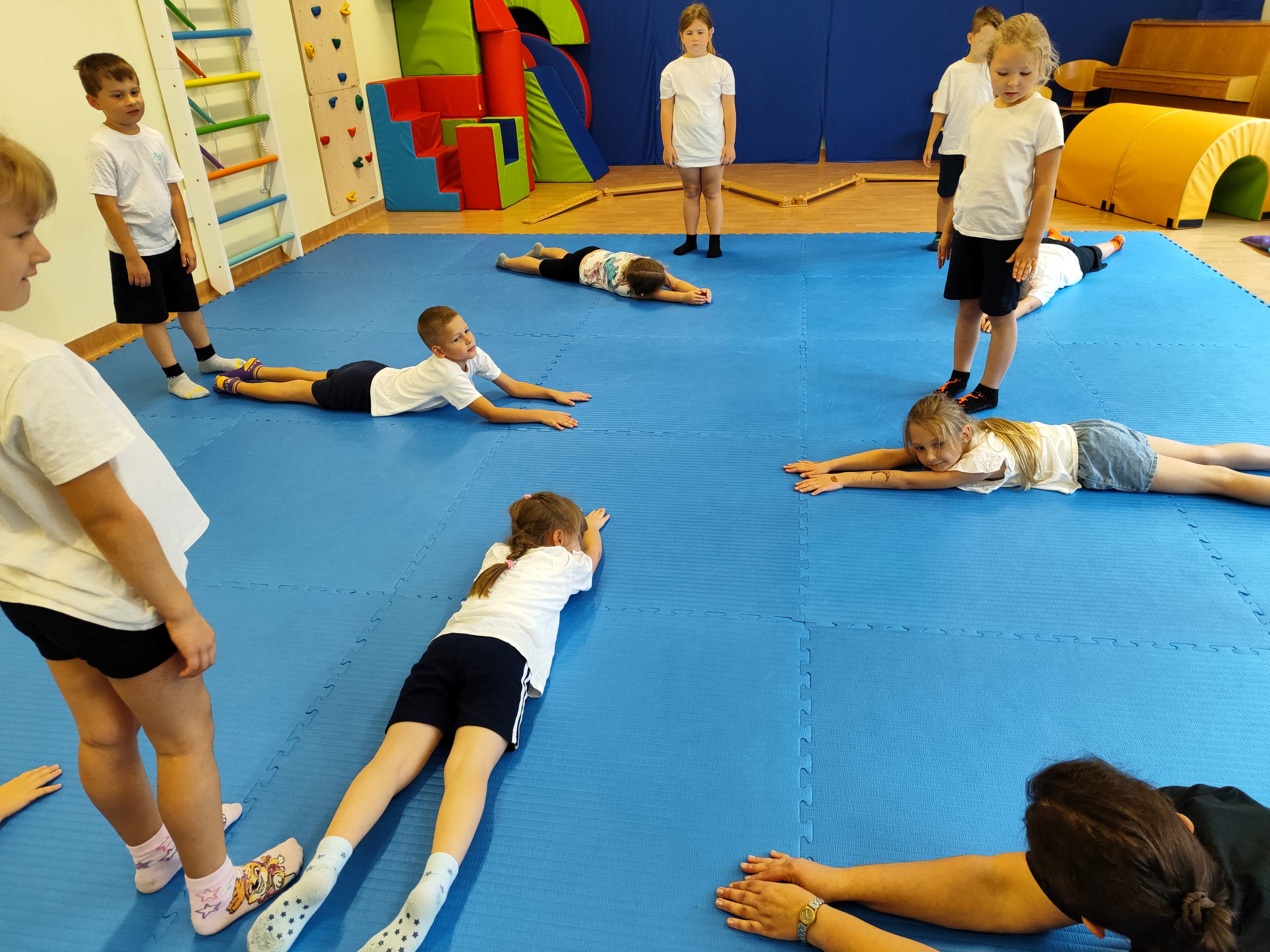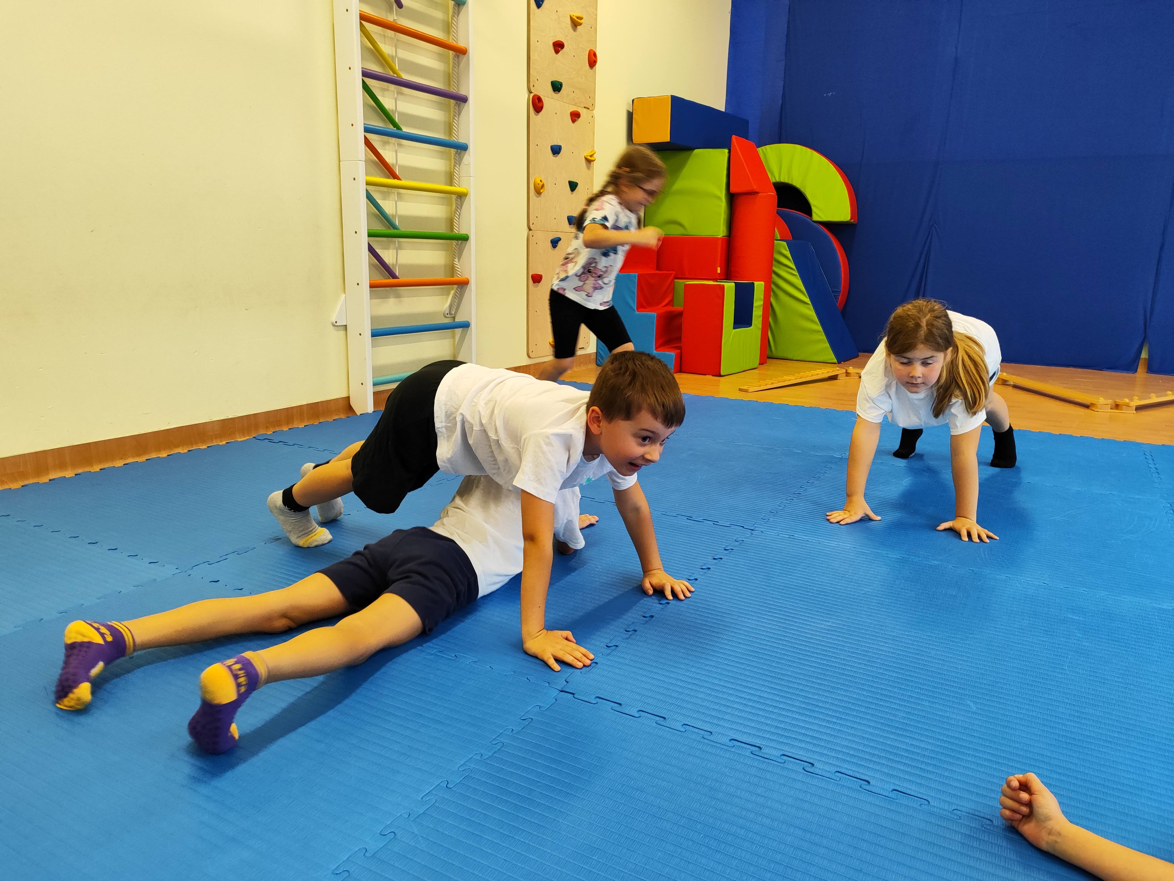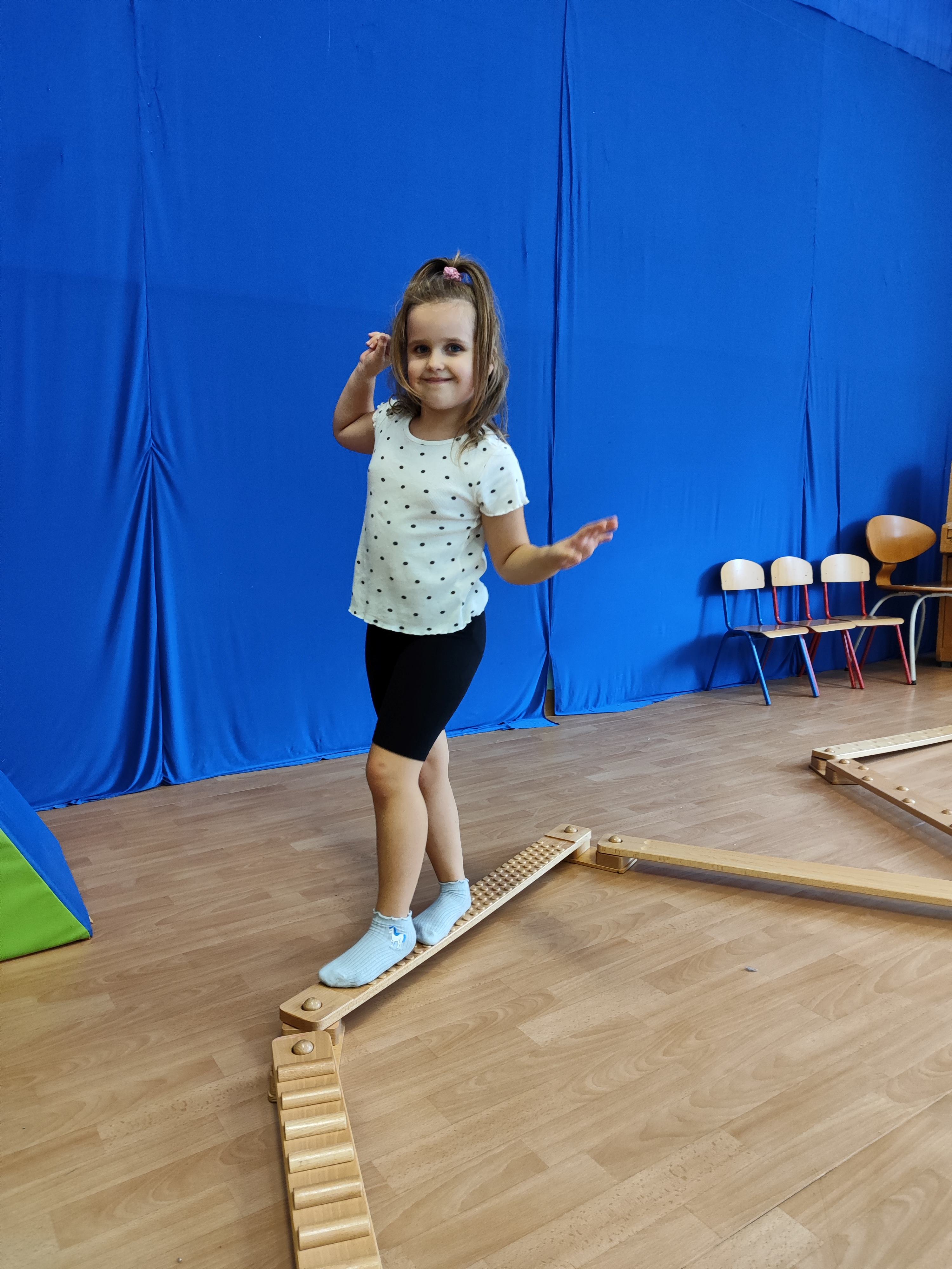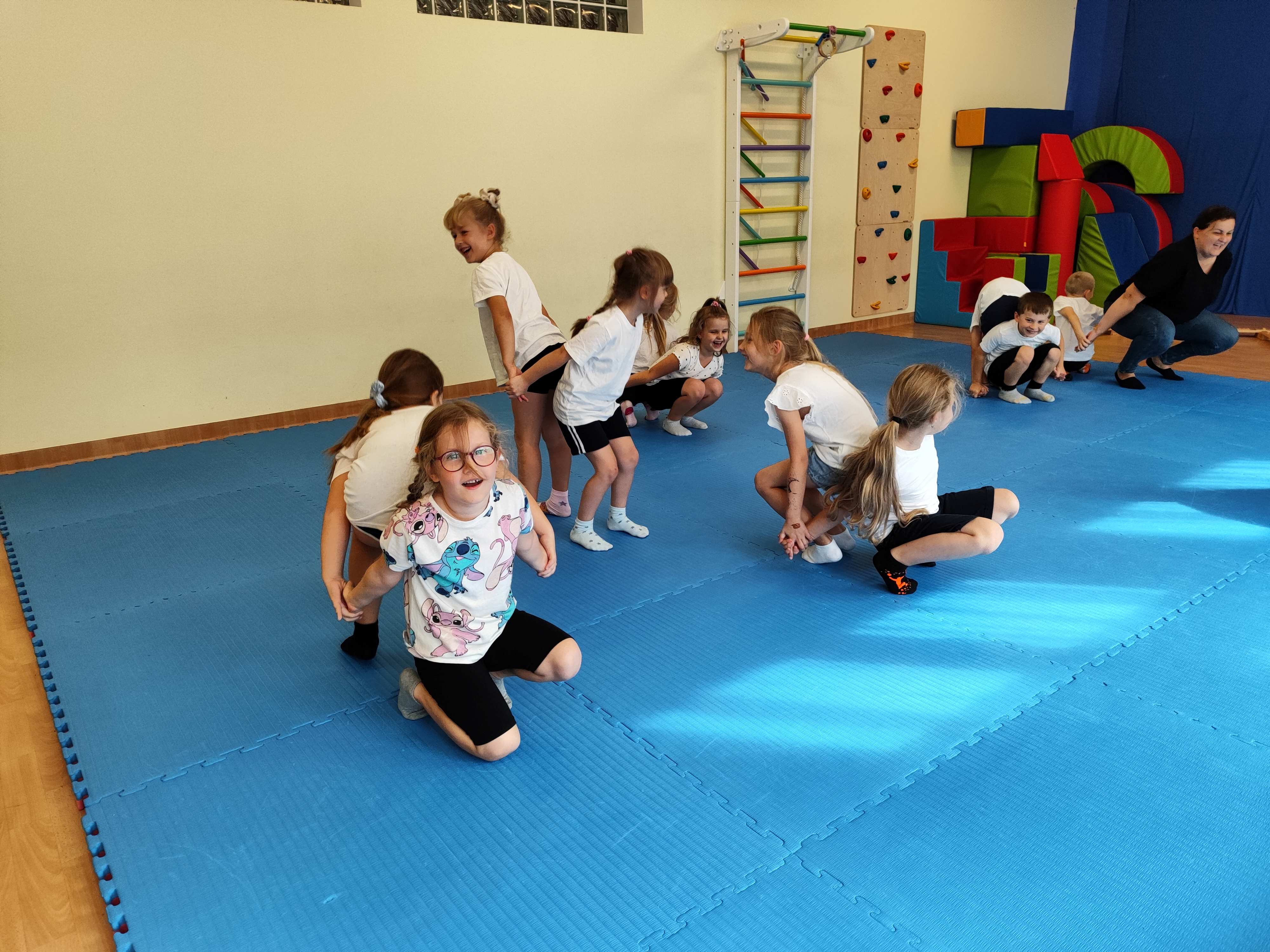 Gimnastyka z Grupą Sówki Dziś Grupa Sówki miała pełne energii zajęcia na sali gimnastycznej Były skoki, tory przeszkód i dużo świetnej zabawy! Ruch to zdrowie — a uśmiechy naszych przedszkolaków mówią wszystko