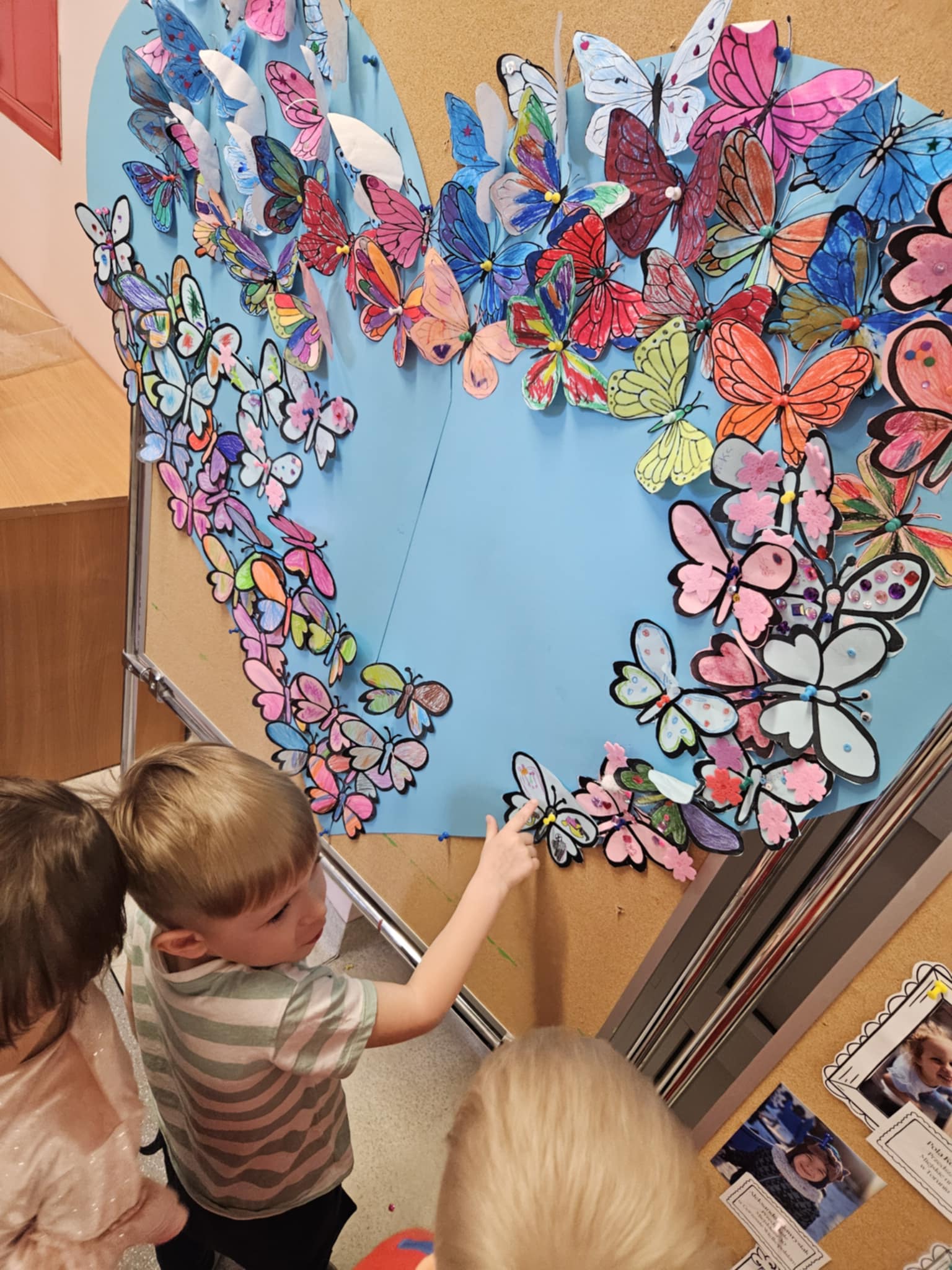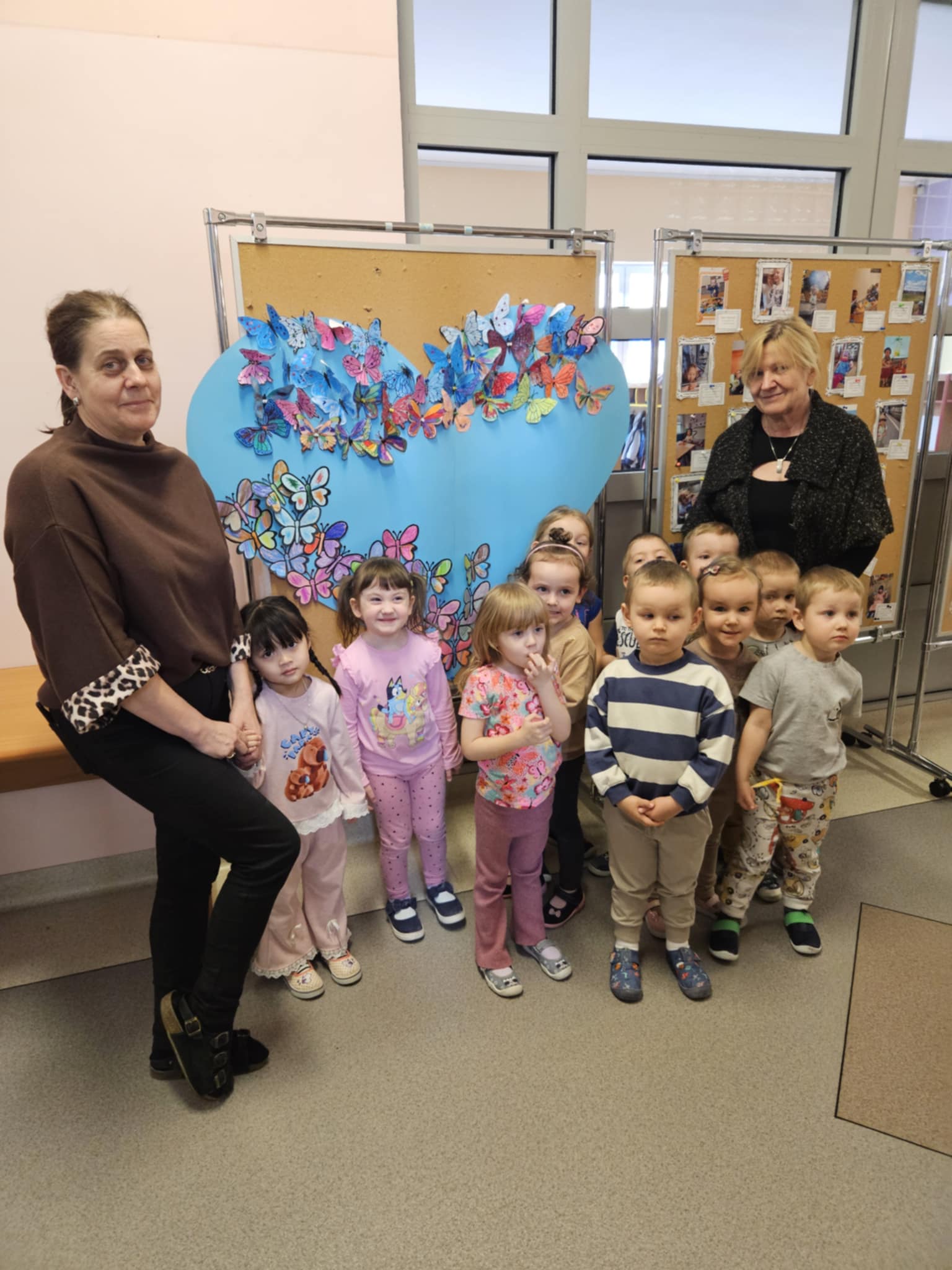 Pamiętajmy, że każdy wykonany przez przedszkolaków motyl, symbolizuje wsparcie i zrozumienie dla osób z autyzmem. Przedszkolaki przyklejały swoje motyle tworząc Serce, które będzie przypominać nam o sile wspólnoty i akceptacji.