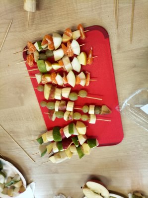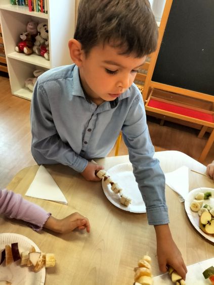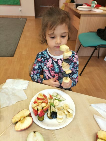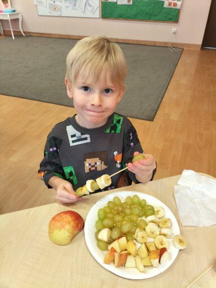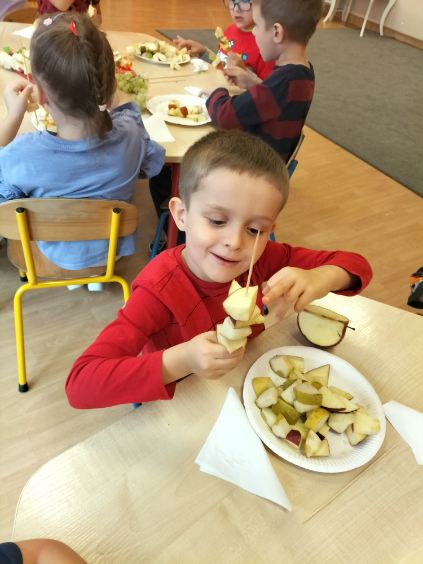 Dzieci zamieniły się w małych kucharzy i z wielkim zaangażowaniem tworzyły własne szaszłyki owocowe. Podczas pracy dzieci uczyły się rozpoznawać owoce, rozwijały motorykę małą oraz ćwiczyły cierpliwość i współpracę .