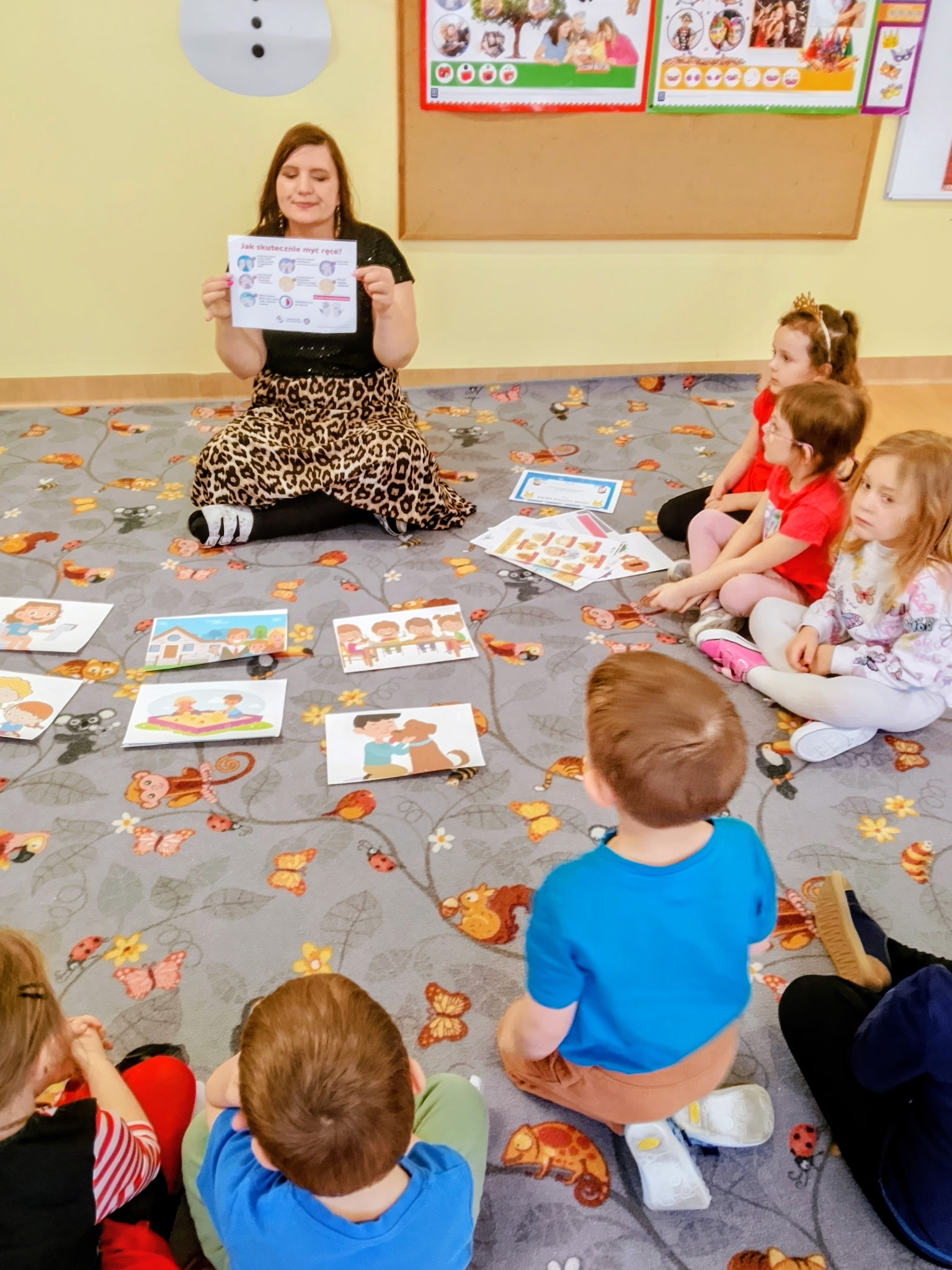 Poznały bohaterów bajki edukacyjnej "Brudek i Myjka w Rączkolandii" dowiedziały się także dlaczego mycie rąk jest tak ważne, kiedy należy to robić i jakie mogą być skutki zaniedbywania tej czynności. Przedszkolaki dowiedziały się, że na dłoniach gromadzą się niewidoczne bakterie i zarazki, które mogą powodować choroby.