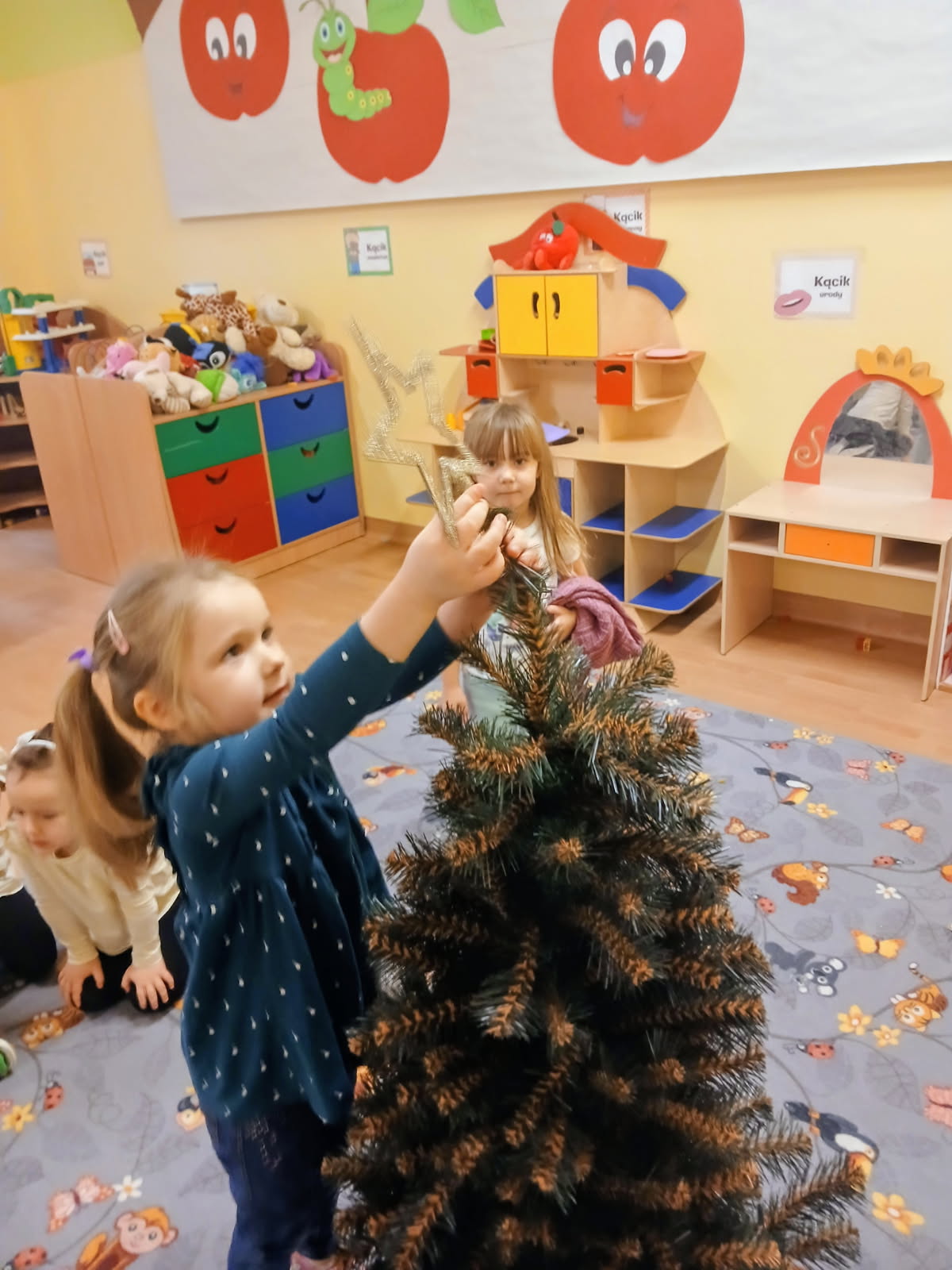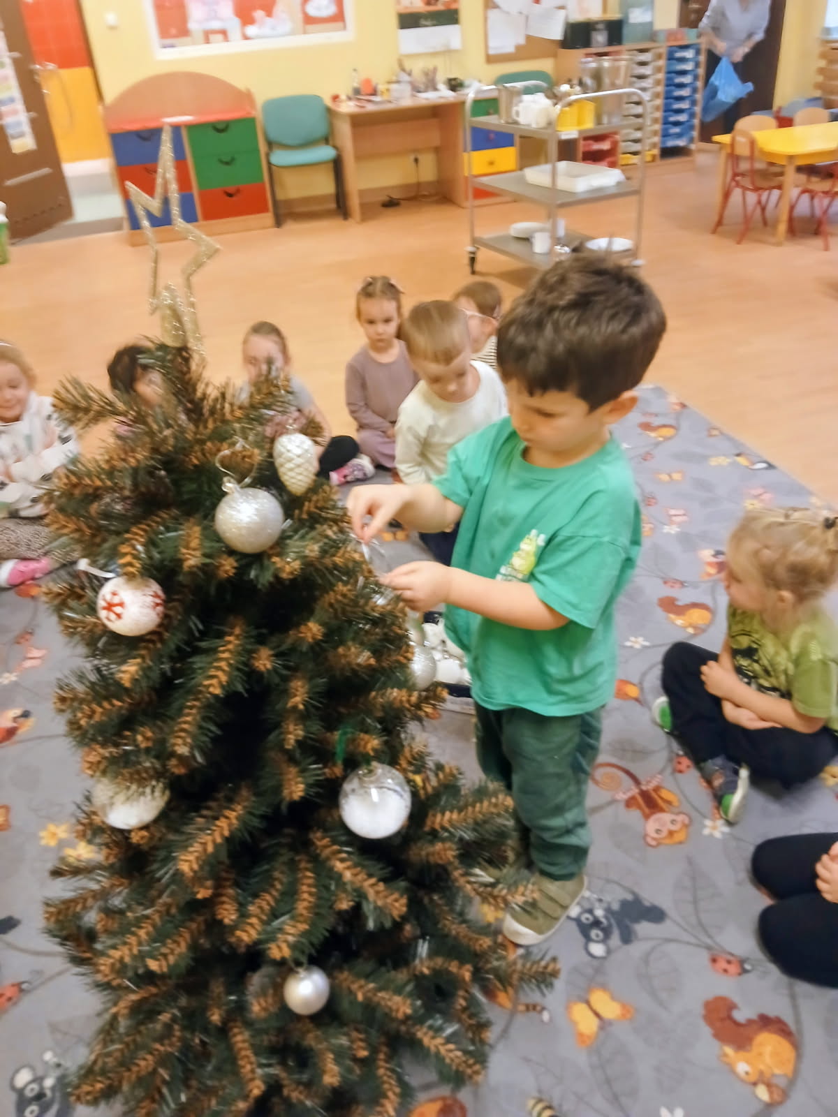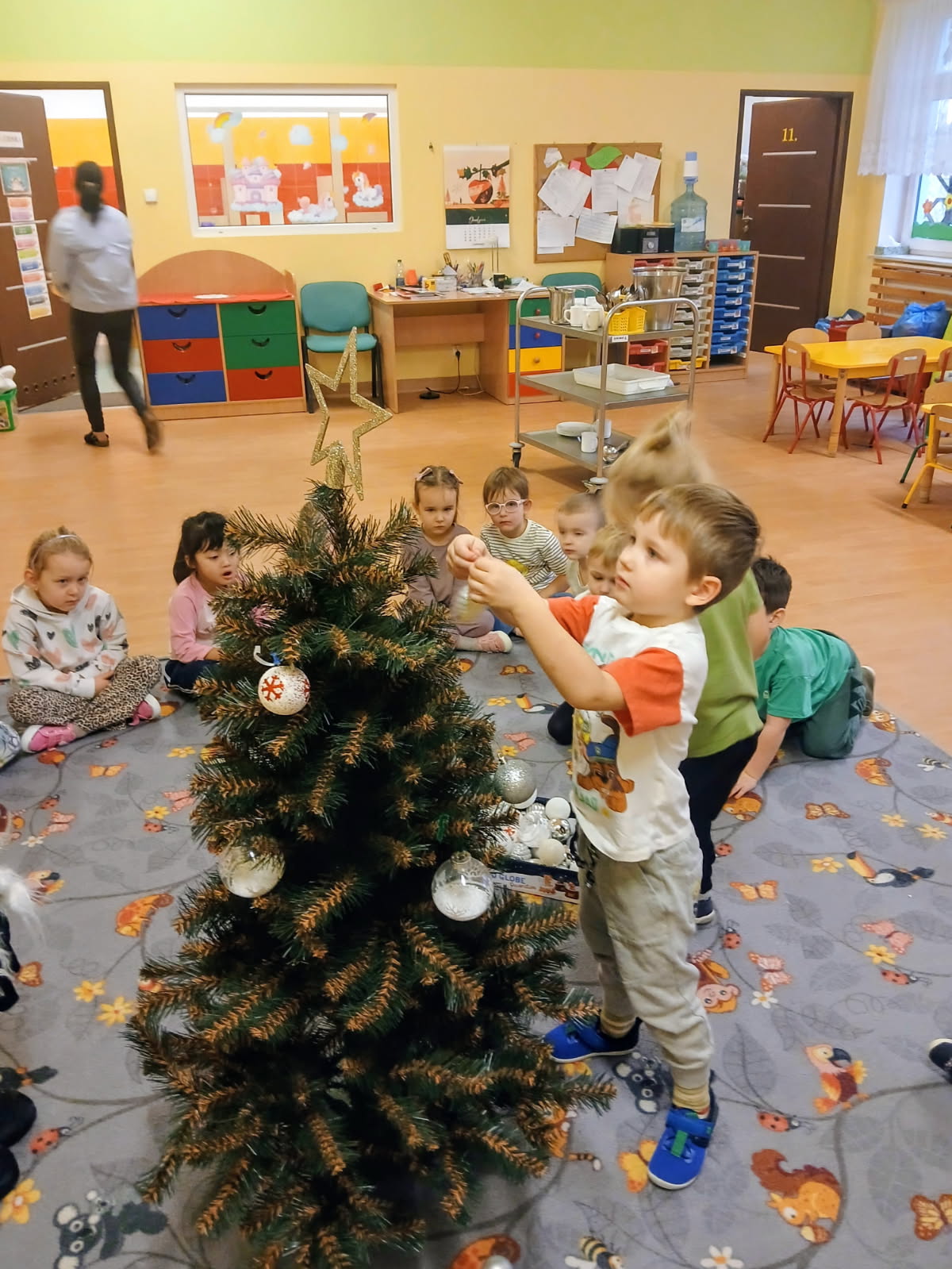 Czas Świąt Bożego Narodzenia wiąże się z tradycją ubierania choinki. To moment na który z niecierpliwością czekały wszystkie przedszkolaki. "Jabłuszka" z zapałem przystąpiły do zawieszania na gałązkach ozdób. Choinka została przystrojona, przypomina nam, że święta są tuż, tuż i Mikołaj jest bardzo blisko.